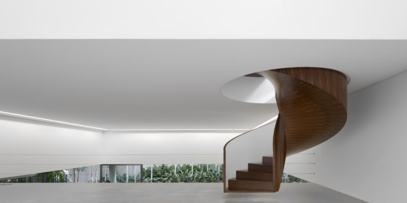 Algumas maquetes produzidas especialmente para a exposição subvertem a lógica tradicional da miniatura arquitetônica. Em um dos exemplos mais emblemáticos, um grande cubo branco revela, em um de seus vértices, o interior de um apartamento projetado por Weinfeld, como se o espaço tivesse sido esculpido na matéria, e não apenas desenhado sobre o papel. Em outro ponto, um nicho horizontal apresenta sete escadas icônicas concebidas pelo arquiteto — da escadaria em vidrotil vermelho da loja Fórum, na Rua Oscar Freire, à escada caracol flutuante em madeira da Casa Cubo. Dispostas lado a lado, assumem caráter quase escultórico, evidenciando como um elemento funcional recorrente se transforma em experiência espacial e gesto formal.